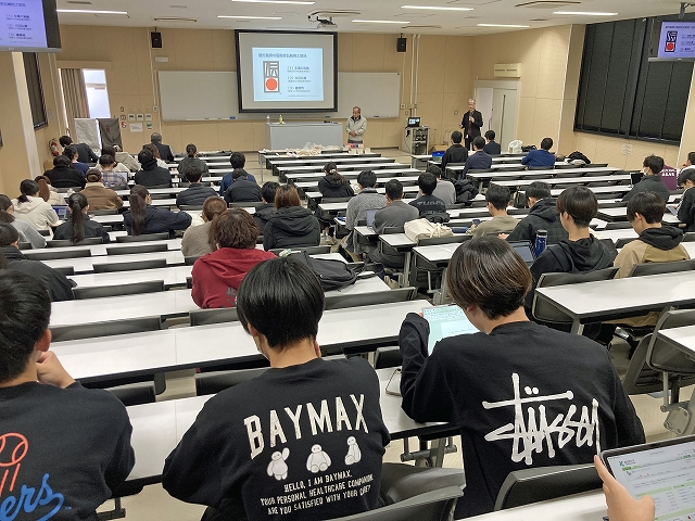 今回この講座を受講したのは1年生の学生さん約60名で、地域の「歴史」「伝統文化」「自然環境」等の特性と課題について多様な視点から理解を深め、自身が暮らす地域の発展に寄与する能力の育成を図ることを目的として開かれました。