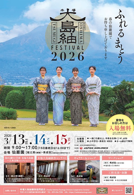 鹿児島県が世界に誇る絹織物「本場大島紬」の魅力を、産地の鹿児島の皆様にも感じていただけますよう、下記概要にて3日間にわたり「本場大島紬フェスティバル」を開催いたします。